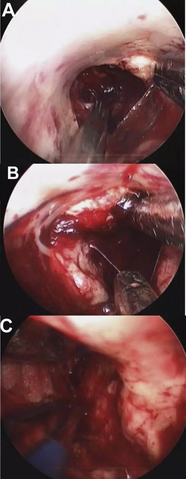 4. 清除血肿时外科医生可将内镜执于左手,同显微镜下操作类似,可以两手操作或是选择助手持镜。还可应用传统的双极电凝通过软膜鞘进入术区烧灼动脉出血点。可以通过调整鞘的方向和深度,以保证完全视野下清除血肿。