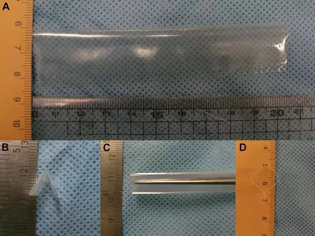 A:鞘膜大小为约 20×100 mm 的聚酯薄膜鞘;B:纵向对折膜鞘,形成 4 层平面的鞘以备置入血肿;C:套在医用镊上在神经导航下进入血肿腔;D:再展开膜鞘为内镜及其他器械创造通路,则此平面鞘变成一个椭圆的内镜外管鞘